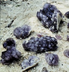 ground. Half an hour of shoveling by the two of us resulted in a hole about three feet in diameter and two feet deep. Suddenly, Jay noticed a few pieces of amethyst on the end of his shovel. It was good amethyst,