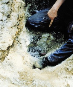 1992: When we explored the Eastman property, we noticed small holes dug in the soil going uphill from the main pit and followed them through the overgrowth. Occasionally we came